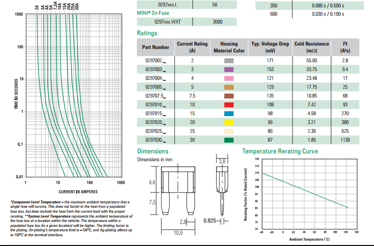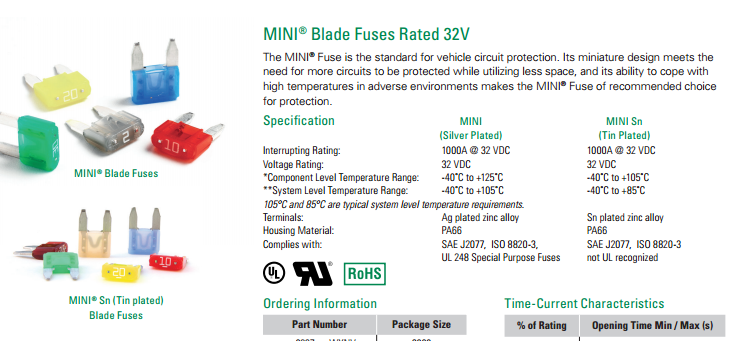 力特保險絲的MINI 系列 - MINI? 32V快熔型汽車插片式保險絲是電流保險絲的一種,當電路電流超過保險絲額定電流的2倍時就會在幾秒內熔斷,起到電路保護的作用.常用于汽車電路過流保護,也用于工業設備的過流保護