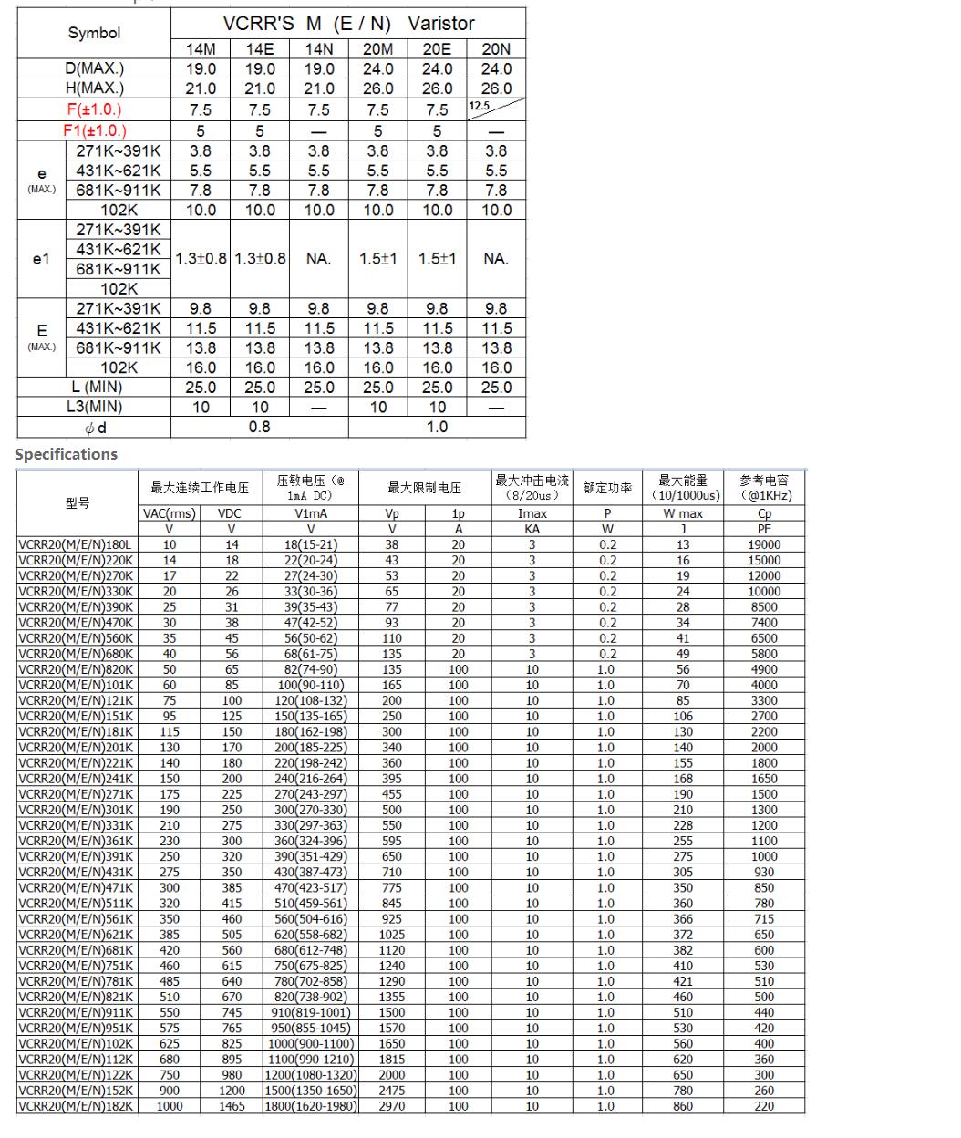 ?壓敏電壓從(18V-1800V) ?具有UL ,TUV認證,符合RoHS,Reach標準,無鉛 ?專利的集成熱保護裝置 - ?旨在促進符合UL1449第3版SPD產品 ?和促進符合IEC62368 ,IEC61643-331產品 ?高峰值浪涌電流額定值高達10kA ?波可焊 ?標準引線形式和間距選項 ?低泄漏 ?-55°C至+ 85°C的工作溫度范圍