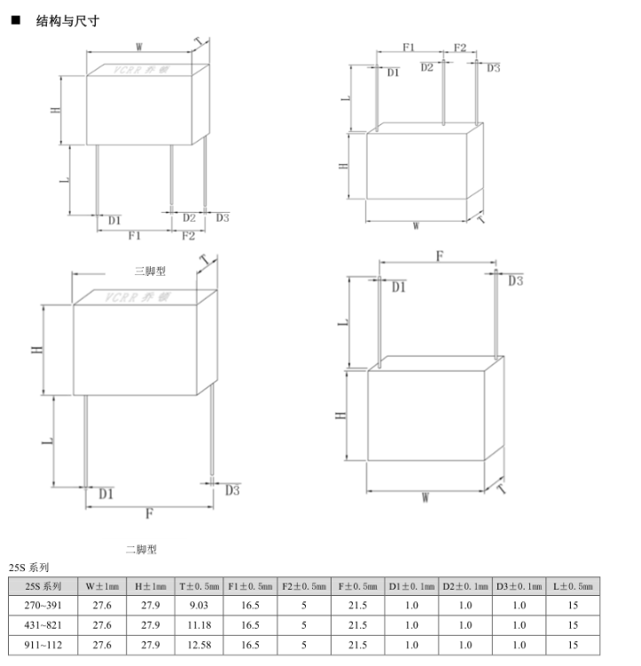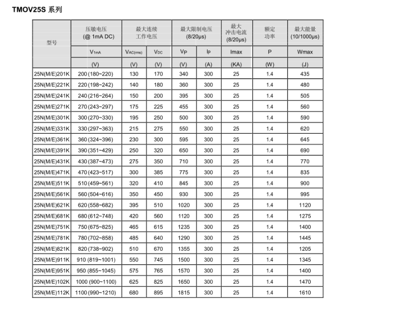 ?壓敏電壓從(18V-1800V) ?符合RoHS,Reach標準,無鉛 ?專利的集成熱保護裝置 - ?旨在促進符合UL1449第3版SPD產品 ?和促進符合IEC62368 ,IEC61643-331產品 ?高峰值浪涌電流額定值高達25kA ?波可焊 ?標準引線形式和間距選項 ?低泄漏 ?-55°C至+ 85°C的工作溫度范圍.產品通過UL,TUV,CQC認證