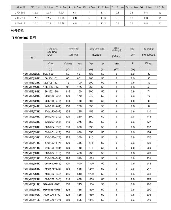 ?壓敏電壓從(200V-1800V) ?符合RoHS,Reach標準,無鉛 ?專利的集成熱保護裝置 - ?旨在促進符合UL1449第3版SPD產品 ?高峰值浪涌電流額定值高達6kA ?波可焊 ?標準引線形式和間距選項 ?低泄漏 ?-55°C至+ 85°C的工作溫度范圍 產品通過UL,TUV,CQC認證