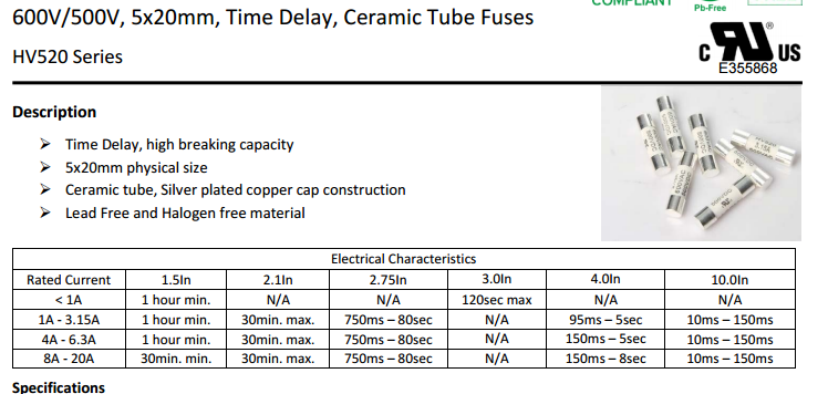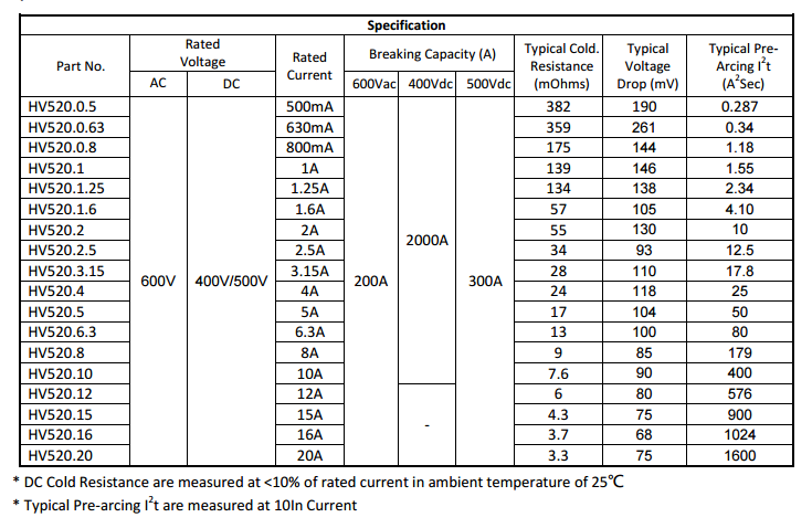 熔斷器HV520 600VAC 400/500VDC 500mA-20A 索取樣品