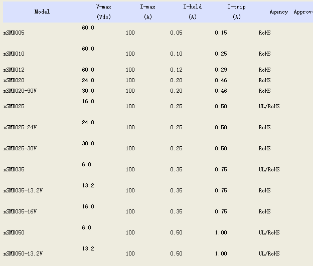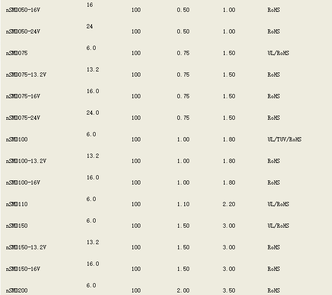 nSMD (1206) Series SMD貼片自恢復(fù)保險絲型號規(guī)格: